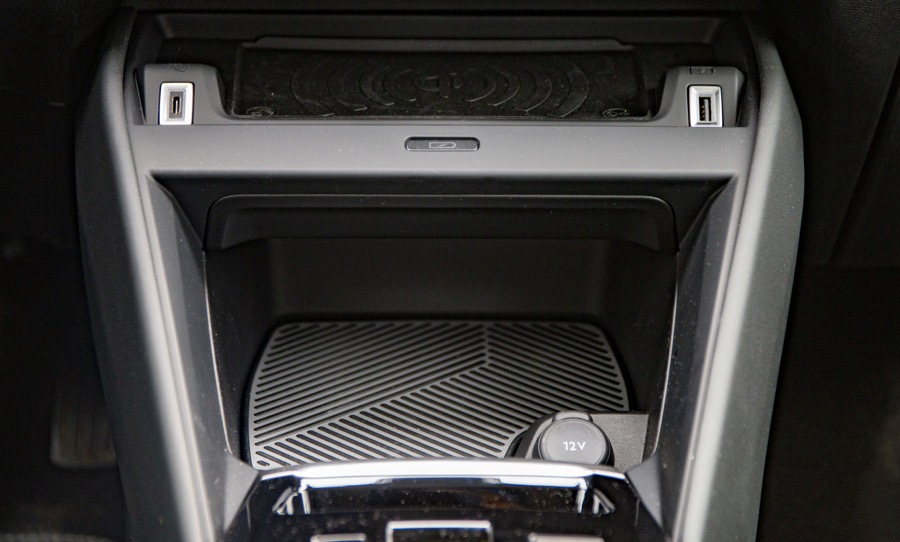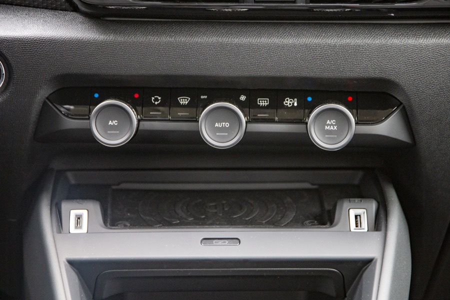 A műszerfal tetejére került az infotainment rendszer érintésérzékeny képernyője, amely kapott egy kisebb zongoralakk talpat. Ez összeköti a szellőzővel az egységet. Kicsit lejjebb található néhány benyomható gomb és tekerő a klíma és az ablakfűtés kapcsolásához. Ez nagyon szimpatikus, mivel a Peugeot modellekben, nem nagyon szívesen értem hozzá a kissé nehezen reagáló érintésérzékeny zongoralakkal bevont felületekhez. Lentebb vezeték nélküli töltő és USB csatlakozók kaptak helyet, na meg egy kisebb tároló. Dicséretes, hogy megpróbáltak egy életszerű helyre telefontartót tervezni, ennek előnyeit az első fékezésig élveztem, mivel akkor a telefonom a már említett tárolóban kötött ki, némi levegőben töltött idő után. Természetesen otthon az USB-C kábellel már össze tudtam hozni a telefontükrözést, ezzel pedig megoldódtak a problémák is.