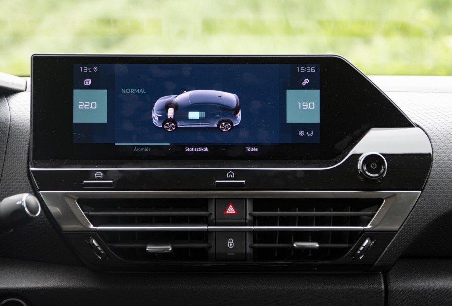 Az ë-C4-be beülve egyfajta nyugalom lett urrá rajtam, ez szerintem az autó karakteréből is adódik, hiszen mindent kicsit lassabban abszolvál, kezdve a Start gomb megnyomása utáni reakcióidővel, a gyorsításokon át az infotainment lassúcska működéséig. Ezek nem idegesítően lassan történnek, csupán kicsit lassabban, mint a rohanó hétköznapokban diktált tempóm. Az ülés egyébként könnyű „elfolyni”, mivel nem nagyon van oldaltartása. A térdemet kicsit nyomta a középkonzol oldalán található könnyen tisztítható műanyag. Hiányzott az egy pedálos vezetési mód, bár „B”-be rakva szépen tölt vissza. A kormány hihetetlenül könnyen tekerhető. A hatótávot egész pontosan jelzi vissza, ez felüdülés volt, mivel ezzel szoktak lenni problémák más típusoknál. A futómű kellemesen kisimítja az úthibákat. Egy fekvőrendőrön áthaladva még méterekkel később is, kicsit hullámzik a kasztni, szépen kimozogja az út egyenetlenségeket. Kellemes a közlekedés vele, városban pedig kifejezetten hasznos a kettes szintű önvezetés, amit itt a Highway Driver Assist csomag takar. Az adaptív tempomat jól szuperált, akárcsak a sávtartó, ami nem faltól falig működik, hanem igyekszik finom korrigálásokkal a sáv közepén tartani az autót. Viszont ettől még egy percre sem szabad magára hagyni a rendszert, ugyanis az aktív kormányzás megszűnésére nem figyelmeztet hangjelzéssel, ami lássuk be picit veszélyes.