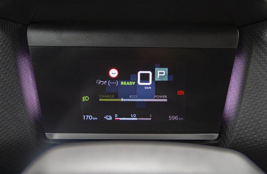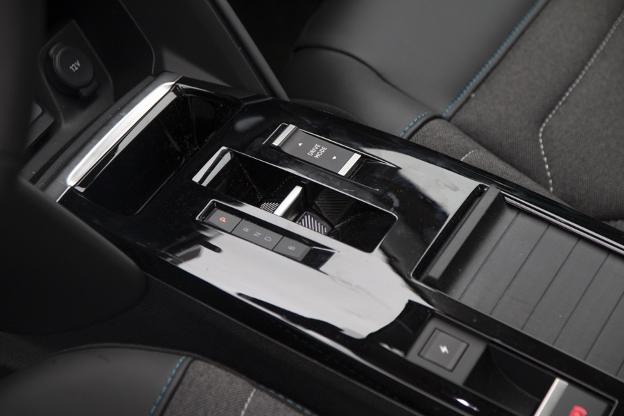 A két ülés között kapott helyet az irányváltó kar, amely eltér a korábban megismert PSA-hoz tartozó tesztautókban látottaktól. Itt már egy elegáns billenőkapcsoló található. Emellett jobb oldalon a drive mód választó gomb látható, bal oldalon pedig az irányváltó szokásos jelölései olvashatók.