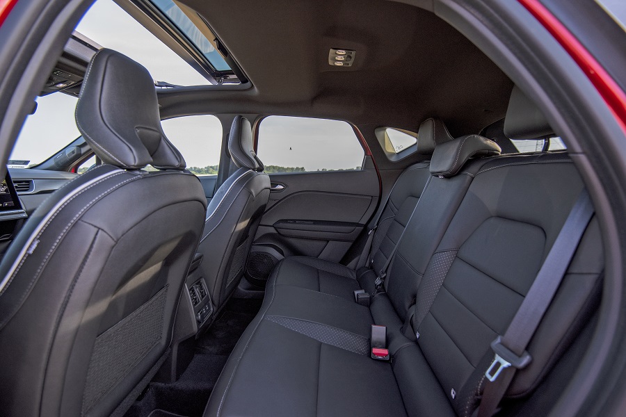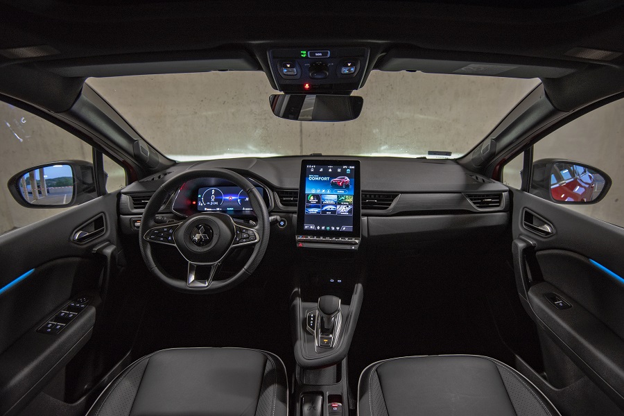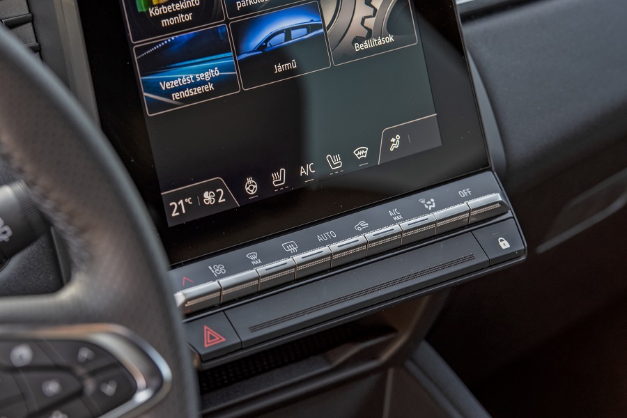 A kocsi belsejében a sötét színek dominálnak, de a négy fokozatban állítható elektromos panorámatetőnek köszönhetően több napfényt engedhetünk be az utastérbe. A műszerfal és az ajtók borítása kemény műanyagból készült, de mégsem zörög. A kormány fogása jó, a rajta lévő gombok pedig ismerősek lehetnek a Renaultból. A vezető egy 10 colos digitális műszeregységről olvashatja le az utazáshoz szükséges információkat. Középen egy 10,4 colos infotainment képernyőről vezérelhetjük többek között a multimédiát, a navigációt, a szellőztetést, valamint itt tudjuk kiválasztani a vezetési módokat (Comfort, ECO, Sport, egyéni) is. Fizikai gombokkal is találkozunk a középkonzolon, amivel a szellőztetést tudjuk szabályozni. Indukciós telefontöltő, valamint két darab USB-C port is a rendelkezésünkre áll, az Android Auto és az Apple CarPlay pedig vezeték nélkül is működik. A 9 hangszórós Harman/Kardon prémium audiorendszer fantasztikus hangzást biztosít az utazásunk során.